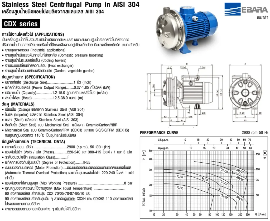 แสตนเลส Ebara ปั๊มหอยโข่ง โรงงานอุตสาหกรรม CDXEBARA ปั๊มหอยโข่งแสตนเลส 380V (1HP) รุ่น CDX-90/10