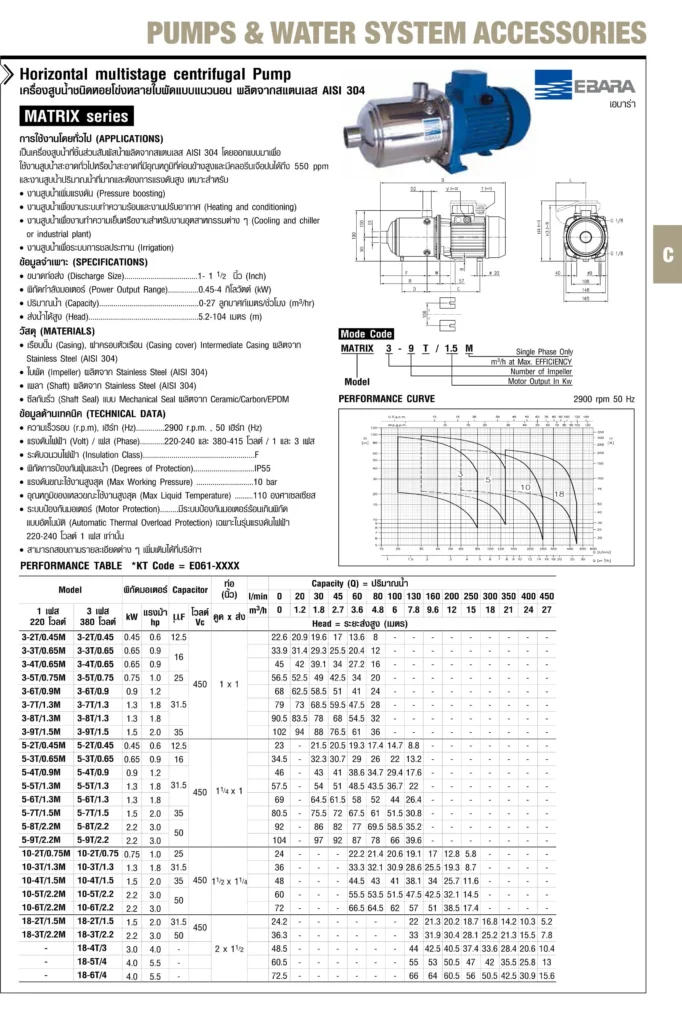 แสตนเลส Ebara ปั๊มน้ำหลายใบพัด งานที่พักอาศัย งานเกษตรกรรม และชลประทาน โรงงานอุตสาหกรรม MATRIXEBARA ปั๊มน้ำสแตนเลส หลายใบพัดแนวนอน รุ่น MATRIX 3-9T/1.5M
